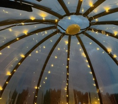 По факту у каждой семьи свой номер, с отдельным входом, общее пространство с кухней и огромной столовой на втором этаже и чилл-зона в сфере на третьем.