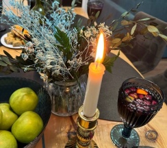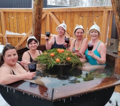 Наслаждались чаном. Классно, что в чане есть даже столик. Мы разместиои мандарины и бокалы с глинтвейном на нём.