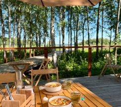 Если вы думаете, где отдохнуть за городом, повести мероприятие для компании, смело выбирайте это местечко. Уединение с природой, красота местности, причал, с которого вы можете всей этой красотой полюбоваться - не оставит вас равнодушными. А ещё сервис. Мы располагались в шатре- куполе, с террасой и выходом к озеру. Это потрясающе. Можно посидеть на свежем воздухе, пожарить шашлык, посмотреть закат. Весь необходимый инвентарь имеется.