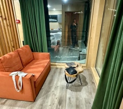 Оставались здесь два раза - один раз в домике на 2 комнаты и один раз в однокомнатном. На кухне есть все - посуда, детская посуда, доска, тряпочка, мыло, губка, штопор, большой рулон полотенец, микроволновка, холодильник, чайник.