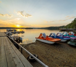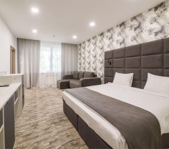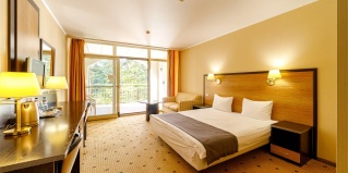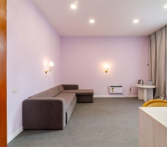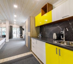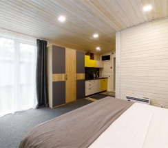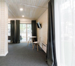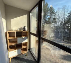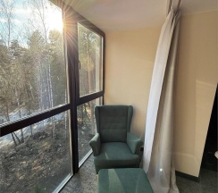 Светлый и уютный номер с великолепной панорамой на озеро "Еловое". Номер оборудован всем необходимым и рассчитан для проживания двоих гостей с возможным размещением ребенка или дополнительного гостя на комфортном раскладном диване. Рабочая зона, фен, мини-бар, телевизор, телефон, эл.чайник, туалетно-косметические принадлежности, чайный набор, панорамные окна, балкон.