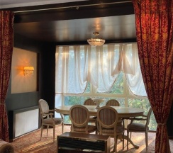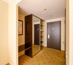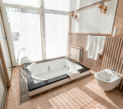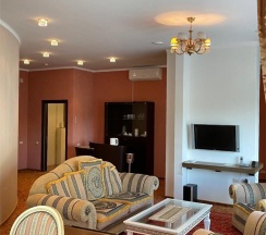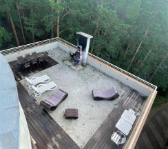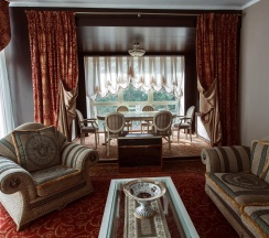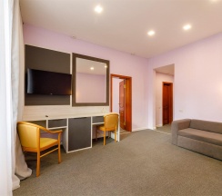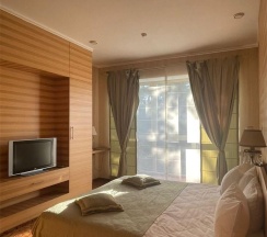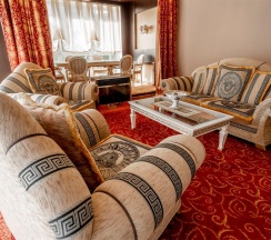 Гостиная с обеденной зоной и зоной отдыха, спальня, ванная комната, терраса с собственной мангальная зона, туалетно-косметические принадлежности, халат, тапочки, мини-бар, LCD TV, DVD, телефон, кондиционеры, сейф