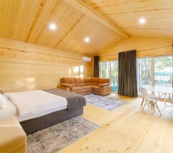 Уютный, просторный шале площадью 50 кв2, оснащен всем необходимым для комфортного отдыха вдали от городской суеты. Кухня, терраса, собственная баня и территория для отдыха - 50 метров.