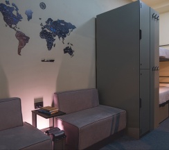 Женский восьмиместный номер. При заселении предоставим комплект белоснежного постельного белья и два полотенца. Для каждого гостя предусмотрен индивидуальный шкафчик, выдвижной ящик и вешалки. Спальное место оборудовано светильником, USB розеткой и держателем для телефона или книги.