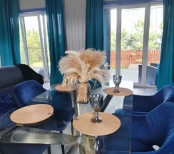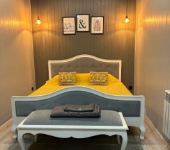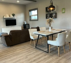 В доме одна спальня с двуспальной кроватью и большая гостиная совмещенная с кухней (раскладной диван и 2 раскладных кровати с матрасом. На кухне размещен стол и 4 стула.