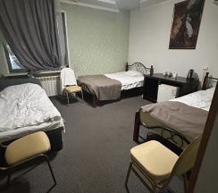 Хороший придорожный отель, ехали 05.12.2025, цена за 3-х местный номер 3000р. В номере хорошее белье страйп-сатин, холодильник, одноразовые зубные щетки, тапочки, шампунь, кофе, чай, сахар, минералка по 0,5. Утром отличный сытный завтрак (включен в стоимость): яичница или каша на выбор, бутерброды, блинчики, чай/кофе, йогурт и пироженки. Очень понравилось, обратно ехали 07.12.2025 и снова ночевали в этом отеле.