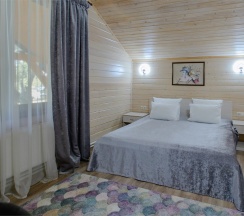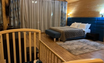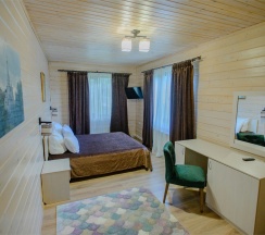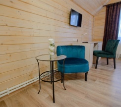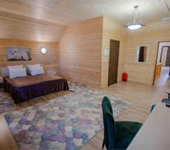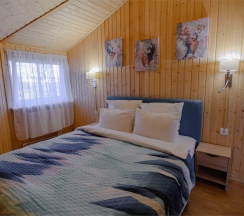 Коттедж Люкс состоит из двух номеров. Первый номер располагает двуспальной кроватью, шкафом для одежды, полкой для багажа и обуви, столом, чайником, феном, холодильником, smart-TV, сейфом, санузлом, а также просторным балконом с видом на водоёмы Усадьбы. В свою очередь, второй номер оснащен диваном, журнальным столиком, письменным столом, стулом и кондиционером. Для самых маленьких наших гостей – мы предлагаем детские кроватки.