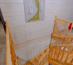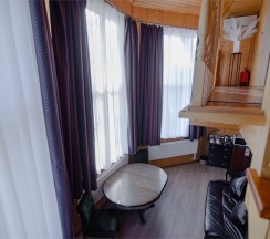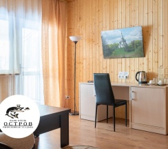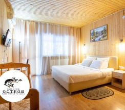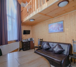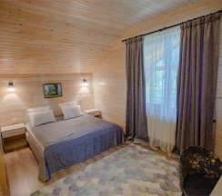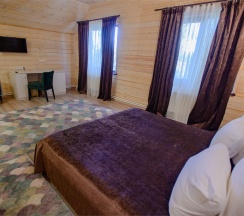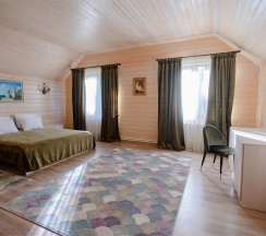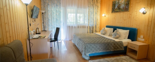 Номер оборудован: двуспальным диваном, шкафом-купе, полкой для багажа и обуви, журнальным столиком, TV, балконом с видом на Усадьбу, кондиционером на 1 этаже; двуспальной кроватью, прикроватными тумбами, журнальным столиком, TV, сейфом, 2 балконами, персональным санузлом на 2 этаже.