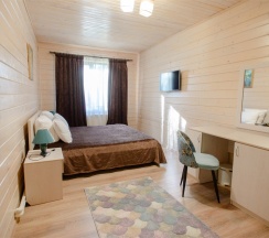 Номер «Стандарт» в коттедже располагает двуспальной кроватью, шкафом для одежды, полкой для багажа и обуви, столом, чайником, феном, холодильником, smart-TV, сейфом, санузлом, а также просторным балконом с видом на водоёмы Усадьбы. Для самых маленьких наших гостей – мы предлагаем детские кроватки.