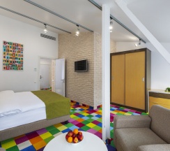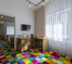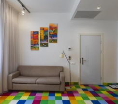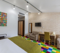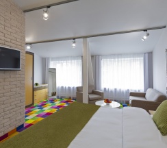 Просторный люкс 45 кв. м с 1 спальней и гостиной, с кондиционерами и телевизорами в каждой комнате. Номер идеально подойдет для пар или семьи из 3 человек. В спальне стоит большая двуспальная кровать 180Х200, шкаф-купе, зеркало в полный рост, журнальный столик и кресло. В гостиной есть раскладной диван, рабочий уголок, холодильник. В номере есть фен, холодильник, телефон, телевизор, кондиционер, сейф, утюг, гладильная доска, чайник, черный и зеленый чай, кофе растворимый, сахар, чашки, стаканы, бокалы для вина, ложки, бутилированная вода, тапочки, халаты, швейный набор, шапочка для душа. В номере работает wi-fi. По запросу: беруши, расческа.