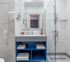 В номере Комфорт площадью 23 кв. м, расположенном в новопостроенном в январе 2025 года крыле отеля, красивый современный дизайн, свежий ремонт и новая мебель: одна двуспальная 180*200 или две односпальные кровати 90*200 ( по запросу гостя), 2 прикроватные тумбочки, кресло, рабочий стол, стул, шкаф, светильник, зеркало в полный рост, и светлая ванная комната со стеклянной душевой кабиной, оснащенной гелем для душа, шампунем, лосьоном, кондиционером для волос, мылом, шапочкой для душа, косметическим, бритвенным и швейным и зубным наборами. Номер удобен для размещения одного или двух человек. Номер оборудован феном, телевизором, кондиционером, сейфом, холодильником, телефоном, утюгом, гладильной доской, швейным, косметическим, бритвенным и зубным наборами, чайником с набором черного и зеленого чая, кофе и сахара, чашками, стаканами и ложками, бутилированной водой, тапочками и салфеткой для обуви. В каждом номере есть wi-fi. По запросу: беруши, халат, бокалы для вина, расческа.