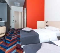 Классический трехместный номер площадью 25 кв. м с тремя полноценными односпальными кроватями 90*200, рабочим столом, стулом, шкафом, прикроватной тумбой, светильником, зеркалом в полный рост, вешалкой с крючками для верхней одежды, креслом и светлой ванной комнатой со стеклянной душевой кабиной, оснащенной гелем для душа, шампунем, лосьоном, кондиционером для волос, мылом и зубным набором. Номер удобен для размещения двух или трех человек, предпочитающих спать на раздельных кроватях. Номер оборудован феном, телевизором, кондиционером, сейфом, холодильником, телефоном, утюгом, гладильной доской, чайником с набором черного и зеленого чая, кофе и сахара, чашками, стаканами и ложками, бутилированной водой, тапочками и салфеткой для обуви. В каждом номере есть wi-fi. По запросу: беруши, расческа, шапочка для душа, косметический, бритвенный и швейный наборы, халаты, бокалы для вина и губка для обуви.