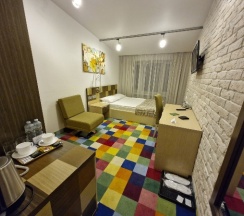 Остановились во время поездки в Москву в Спектрсити Таганская. Гостиница в целом понравилась: чисто, уютно, приветливый персонал, каждые три дня смена белья и уборка в номере,пополнение питьевой воды ежедневно, есть кондиционер. При выборе гостиницы одним из обязательных условий было три отдельных спальных места,т.к путешествовала со взрослыми детьми, это одна из немногих гостиниц, предоставляющих три отдельных полноценных спальных места- это большой плюс. Чего не хватило до полноценной 4-х звёздочной гостиницы из этой ценовой категории, в которых я бывала: полного блек аута: пробивался свет по периметру штор и из под входной двери ночью, второй москитной сетки на окне для полноценного проветривания ночью, второго стула или даже кресла - в номере на 3-х человек один стул, светильники над кроватью - это обычные настольные лампы, которые достаточно яркие- бра бы светило мягче, маленькая диагональ телевизора, ванная маловата для 3-х гостей: нет порожка между душевой и самой ванной, нет места для одновременной сушки трёх полотенец, нет гигиенического душа, падал плохо закреплённый держатель для туалетной бумаги, поэтому снимали ее на тумбу возле раковины, хотелось бы иметь в туалете освежитель воздуха. В целом для ночёвки при проезде в Москве довольно хорошо. Благодарю администрацию гостиницы за гостеприимство и желаю совершенствования и процветания! Всех Вам благ!