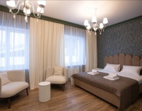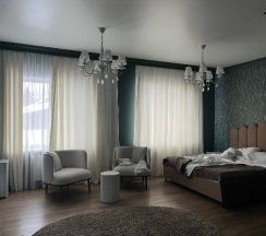 Отель находиться в тихом, спокойном месте. Очень современно оформление, номера также современные, с качественным ремонтом , имеют все необходимое. Кровать хорошая, современная, постельное, подушки все хорошее, придраться не к чему. Есть чайная станция и холодильник. Если что-то нужно любезно приносят. Мы просили посуду. На этаже кулер. Нет ощущения сельской гостиницы , все как в хорошем отеле. Гостиница имеет свой ресторан, он популярный, в выходные все забронировано. Выполнен в стиле охотничьего домика, очень оригинальный, с шикарным камином. Ходили на завтраки к ним, повар просто пушка, бомба. Готовит блюда уровня 5звездного отеля. Омлет с шпинатом и креветками и каким то мусом, это восторг. И хотя это на,машине минут 10 от центра, для нас в таком маленьком городе это не было проблемой. Тишина все окупает. Рядом пятерочка, внизу магазин с самым необходимым.