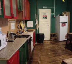 Чисто, убирают, кухню моют после грязнуль-постояльцев. Кухня хорошая, холодильник один и его мало на всех, но как-то помещается. Чай, сахар, кофе бесплатно, вода питьевая из отдельного крана, из мебели длинный стол и лавки.