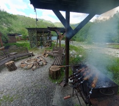 Классная территория, все ухоженное, чистое, глаз радуется. Место выбрано идеально - шикарный вид на горы, рядом чудесная река, на берегу беседки и мангалы. Что еще надо для отдыха? Можно приехать вдвоем и насладиться уединением, можно семьей (детям тоже понравится), можно и с компанией. Цены нормальные. Есть ресторан и бар, но можно и самим пожарить мясо на мангале, что мы и сделали. Однозначно еще приедем