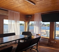 На базе есть все необходимое и даже больше: несколько спальных комнат на втором этаже, 2 большие уборные , сауна, гостевая и зона для отдыха с видом на пирс и Волгу.