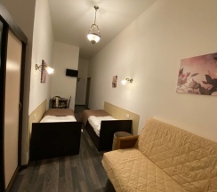 В номере 2 односпальные кровати и двуспальный раскладной диван.