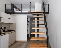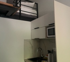 В номере чисто, только пол липковат, есть полотенца, гель и мыло, холодильник, бумага туалетная, фен, жидкое мыло, тапочки, кран с фильтром, микроволновкп, плита и, посуда приспособления для готовки, станция Алиса, 2 телевизора и кондиционер, полотенца меняют каждый день, розетки есть буквально везде, свет можно включать и выключать около кровати. Лестница очень крутая, и расстояние для того что бы наступить мало, иногда страшно спускаться. Как то получилось что оказалось 2 пульта которые подходят только к телевизору с низу. Яндекс станция не может включать телевизоры и кондиционер. Для будильника и поговорить пойдет.