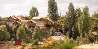 Разноуровневое пространство реализовано террасами вокруг озера. За счет этого из 30 домиков открывается вид на озеро и белые горы. Сами домики — быстровозводимые глэмпы разных моделей, включая первые в России типа «Заха». Террасы, верхние и нижние «этажи» соединяет система деревянных лестниц. За счет этого каждый домик, то что называется, lake view.