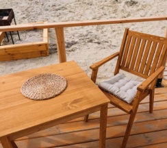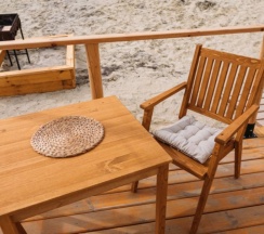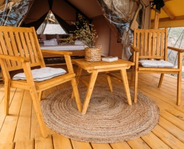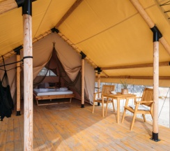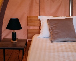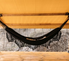 Двухместные домики с просторной комнатой и открытой террасой, на которой уютно расположился гамак. В домике двуспальная кровать. Гостям предоставляются полотенца и постельное белье. Удобства общие на территории глэмпинга.