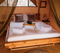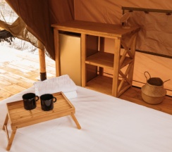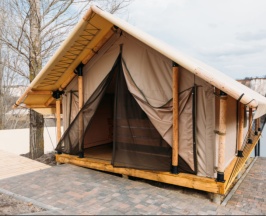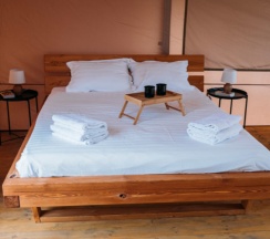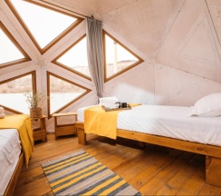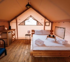 Большие «двухкомнатные» домики на 8 гостей. В домике 2 двуспальные кровати и кушетка, раскладывающаяся в полноценное двуспальное место. Гостям предоставляются полотенца и постельное белье. Удобства общие на территории глэмпинга.