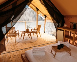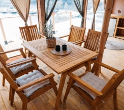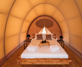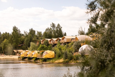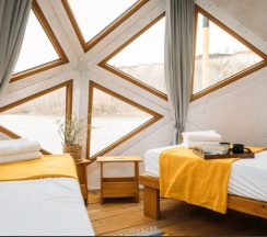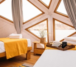 Полусферы с панорамным остеклением и собственной террасой – разместились прямо над водой. В домике двуспальная или две односпальные кровати. Гостям предоставляются полотенца и постельное белье. Удобства общие на территории глэмпинга.