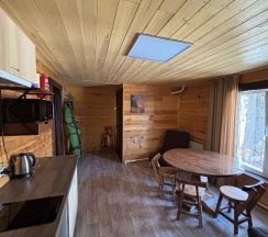 Здравствуйте, отдыхали в Шерегеше 3 суток, с 28.08 по 30.08.24, бронировали номер на 3 этаже. Номер удобный и очень уютный. В нем одна комната, в которой есть все необходимое для комфортного проживания и отдыха: удобная двуспальная кровать и раскладной диван, телевизор, кухонная зона со всеми принадлежностями(посуда, столовые приборы,микроволновка,маленький холодильник, чайник,варочная панель),маленькая яндекс колонка с Алисой, стол и стулья, а также санузел(с душевой кабиной, зеркалом, сушилкой, феном). На входной двери висит большое зеркало. Есть компактная передвижная гардеробная система с вешалками. Между этажами находится стиральная машинка, утюг. На первом этаже есть Антикафе, в котором можно поваляться на креслах-мешках, поиграть в PlayStation и настольные игры, выпить кофе.