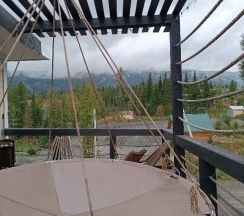 Но и самое приятное🤗 на третьем этаже напротив номера, есть выход на большую веранду(с красивейшим видом на горы!) На веранде стоят кресла кентуки, небольшие столики, большая круглая качель(подвесная), а также купель Фурако!