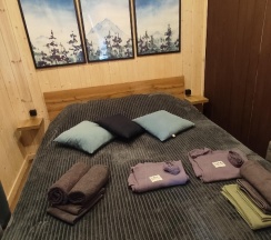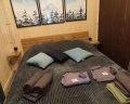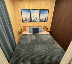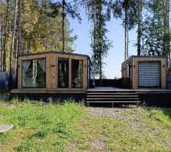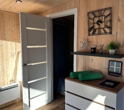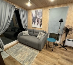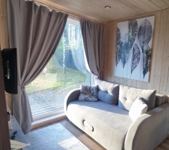 Размещение: есть спальня с двухспальной кроватью и и диван-раскладывается в полноценное двухспальное место. Сам домик новый чистый, есть оборудованная кухня, посуда для сервировки и для готовки.