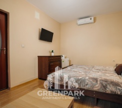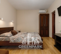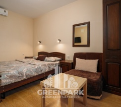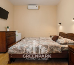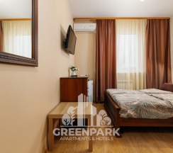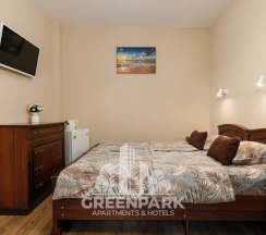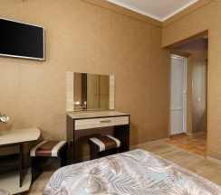 Номер трехместный, площадью 20 кв.м, в котором установлена одна двуспальная кровать и диван. Номер оснащен всеми современными удобствами, которые сделают Ваш отдых максимально комфортным: душ, холодильник, чайник, ванные принадлежности (гель для душа, мыло), полотенца. Из окна открывается вид на бассейн. Номера находятся на 2,3 этажах.