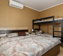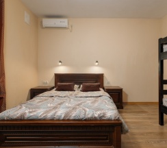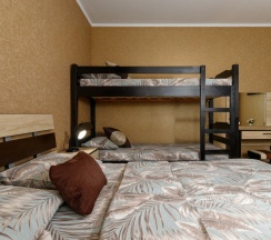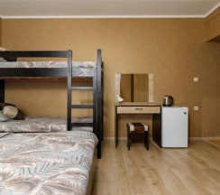 Номер четырехместный, площадью 20 кв.м, в котором установлена одна двуспальная кровать и одна двухъярусная кровать. Номер оснащен всеми современными удобствами, которые сделают Ваш отдых максимально комфортным: душ, холодильник, чайник, ванные принадлежности (гель для душа, мыло), полотенца. Номера находятся на 2 этаже.
