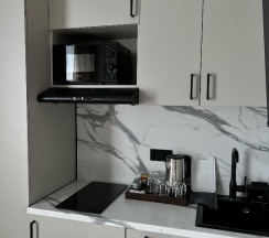 Удобное расположение отеля. В шаговой доступности множество кафешек и кофейни. В здании отеля есть пятерочка, которая работает допоздна, и где можно закупиться продуктами, а в номере кухня полностью оборудована для готовки. Есть плитка, холодильник, чайник, микроволновка и вся необходимая посуда. В номере был чай на выбор черный и зеленый, а еще сахар и специи. Так же в отеле можно заказать завтрак, и его принесут к необходимому времени. Мы один раз заказывали завтрак и остались довольны.