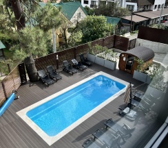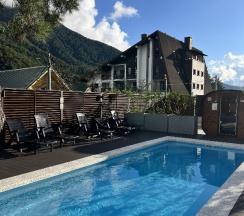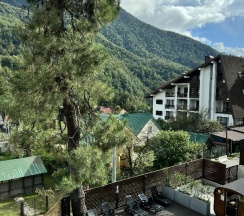 Отличный отель в самом центре Красной Поляны. В доме на первом этаже пятерочка , а в каждом номере кухня. Очень удобно. Шикарный бассейн и отлична баня. Номера просторные, чистые. Матрац очень удобный. Вообщем всем рекомендую этот уютный семейный отельчик.