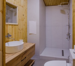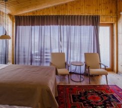 Номер A-Frame — уютный семейный двухэтажный домик, идеально подходящий для компании до 5 человек. Стильный и удобный, он сочетает современный дизайн с атмосферой естественной гармонии с природой. На верхнем этаже расположена спальня, а на первом — просторная гостиная с кухней и обеденной зоной. Домик оборудован современными удобствами, что делает отдых комфортным и приятным. Вокруг — живописные виды, тишина и спокойствие, создающие атмосферу уединения и уюта для всей семьи или компании друзей.