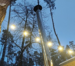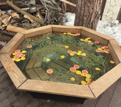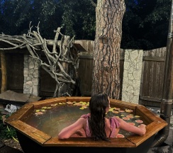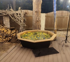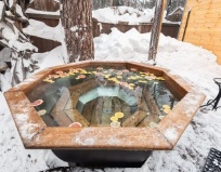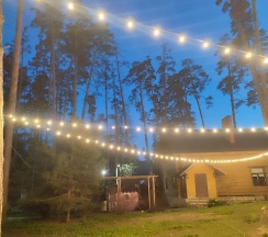 Отдыхали на базе с друзьями. База шикарная. Дорожки почищены, все в иллюминации. Брали баню и чан, который находится на улице. Вода в нем подогревается костром снизу. Я бы в нем сидел и не выходил)))) это потрясающе.