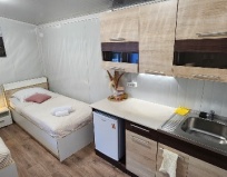 • в комнате — мини-кухня (холодильник, плита, чайник, посуда), стол, кондей, шкафы, 2 табуретки, обогреватель, кровать, телек, вайфай