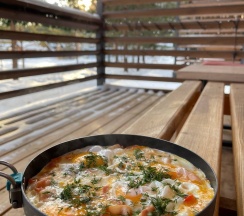 Небольшое и приятное место. Доброжелательные хозяева. Все выглядит новым. Есть минимальный набор посуды. Идеально приехать не поздно, чтобы разжечь костер. На территории есть для этого возможность. Есть мангалы и решетки. Есть веранда для разговоров и чаепития.