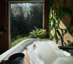 Я остановилась в домике «Лес» — это просто сказка! Очень красивая ванна с видом на лес, уютный деревянный интерьер в лесном стиле, ощущение, что живёшь в доме на дереве. Все удобно и эстетично, как из Pinterest! 😍