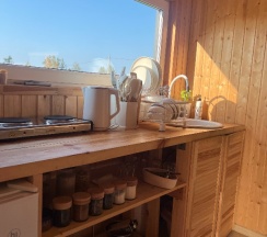 В глэмпинге всё продумано до мелочей: на кухне есть специи и продукты для завтрака — яйца, масло, хлеб. Уютная мангальная зона и купель 🌿