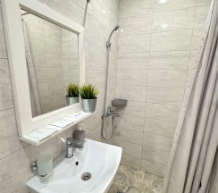 Современный номер DELUXE с 2х-спальной кроватью и небольшим с/у с душевой.