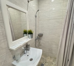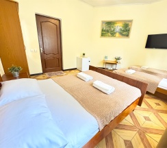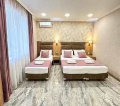 Современный номер DELUXE с 2х-спальной кроватью , односпальной кроватью и небольшим с\у с душевой.