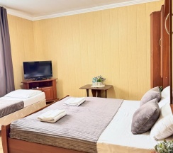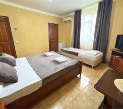 Номер оснащен: одна двуспальная и две односпальные кровати , с белоснежным постельным бельем из натуральных тканей и персональные полотенца, шкаф с зеркалом , вешалки для одежды, мини -холодильник, фен, тапочки, журнальный столик, прикроватные тумбочки, кондиционер.