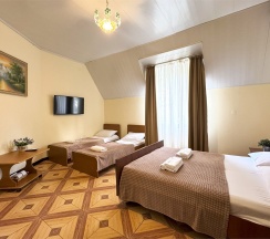 Номер оснащен: двуместной и односпальной кроватью с ортопедическими матрасами, тумбочками, светильниками, шкафом для одежды, журнальным столиком, мини-холодильником, кондиционером, телевизором с плоским экраном , смарт-ТВ, бесплатным доступом к WI-FI. Номер укомплектован премиум качества белым постельным бельем и полотенцами, тапочками. В ванной комнате, укомплектованной феном и набором туалетно-косметических принадлежностей, установлен душ. Чайная станция в холле на этаже. На верхние этажи подниматься можно только по лестнице.