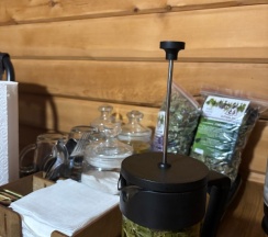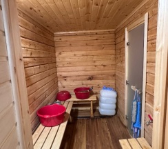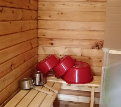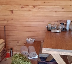 Баня великолепна, хороший влажный пар, веник дали, поддаешь сколько тебе нужно, печь на дровах, сам дрова подкидываешь, возле бани бассейн, самое то после парилки, большой стол внутри,много видов чая и разнообразие меда.