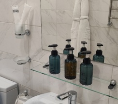 Два полотенца на 1 человека, есть стационарные гель для душа, жидкое мыло, шампунь (всё хорошего качества).