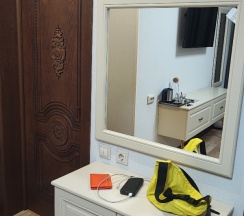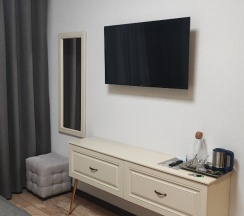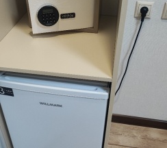 В номере мини чайник, кружки, чай/кофе/сахар, сейф, телевизор, холодильник.