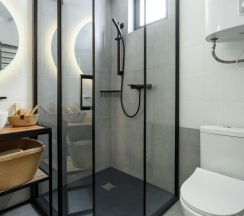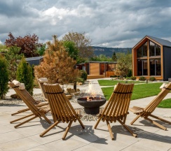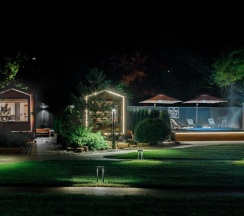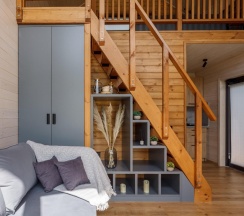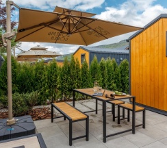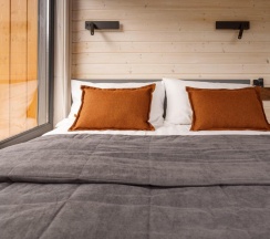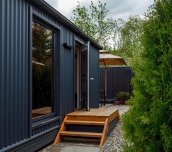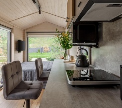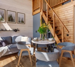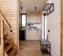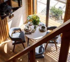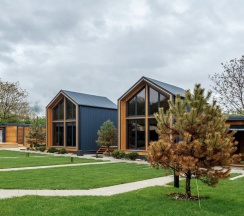 На территории расположены четыре уютных дома в стиле Barn — стильные, светлые, с продуманной эргономикой и вниманием к каждой детали. В каждом доме есть все для максимального комфорта, кухня со всем необходимым, ванная комната и голосовой помощник Алиса, который поможет включить музыку или напомнит рецепт ужина. У каждого дома — собственный дворик с мангальной зоной и большим зонтом с LED-подсветкой, где приятно проводить вечера даже в дождь.