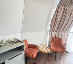 Классная база отдыха, для пары или же семьи из 4 человек очень здорово! В сферах одно двуспальное место и на втором этаже два односпальных места для детей. На улице расположен крытый мангал и мы брали с купелью, купель горячая, в -15 очень тепло было в ней сидеть)) благодарим за гостеприимство😊🫶🏻
