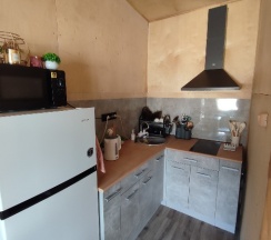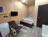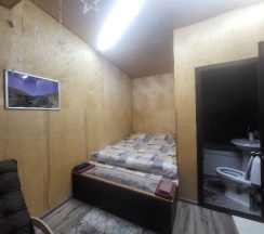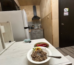 Маленький, уютный, чистый номер. Есть кухня, холодильник, чайник, плита. Все достойно. Очень приветливый добрый хозяин. Рекомендую к проживанию. Удобно для компании. Все в одном месте, но в разных комнатах. Имеется мангальная зона.